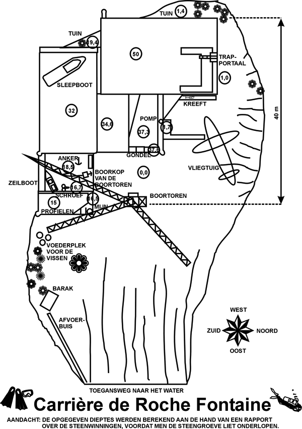 De overgangen tussen de verschillende dieptes zijn gescheiden door loodrechte wanden. De maximum diepte die men in deze steengroeve kan bereiken is 53 meter (achteraan links in de hoek). Vergeet echter niet dat het volgens het veiligheidsreglement Nelos verboden is dieper dan 40 meter te duiken in steengroeven. Je ziet er onder andere een complete kraan (boortoren), voorzien van boorkop die gelegen is op 20 meter. De lengte van de kraanarm, die zich boven het wateroppervlak bevindt is 45 meter. De stuurcabine van de kraan vindt men terug op 4 meter diepte. Er werd een in 1929 gebouwde sleepboot van 10 meter afgezonken. Om de steengroeve nog aantrekkelijker te maken werd er ook een zeilboot geplaatst en een schroef. |  © Ivo Madder |